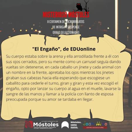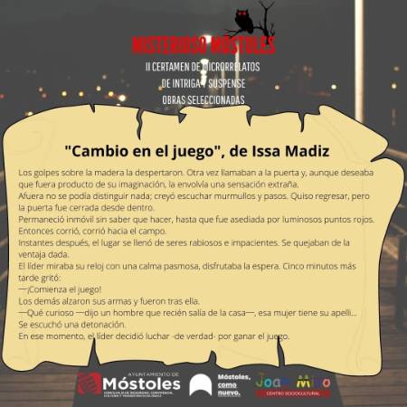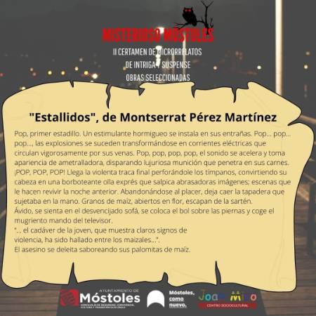 La Concejalía de Seguridad, Convivencia, Cultura y Transición Ecológica convoca por segundo año "Misterioso Móstoles", II Certamen de Microrrelatos de intriga y suspense que ya en su primera edición tuvo una gran acogida con unos 250 participantes.