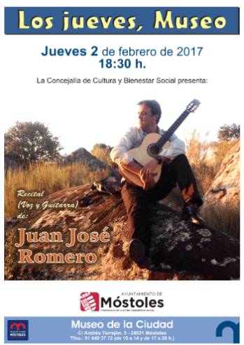 uan_Jose_Romero_PortadaProgramaImagen en alta resolución. Este enlace se abrirá mediante lightbox, puede haber un cambio de contextouan_Jose_Romero_PortadaProgramaLa Concejalía de Cultura y Bienestar Social presenta en el Museo de la Ciudad el jueves 2 de febrero a las 18:30 horas el concierto "Acíbar de Juglares", interpretado por Juan José Romero Ariza. Las entradas se podrán retirar en el Museo de la Ciudad, a partir del martes 31 de enero.