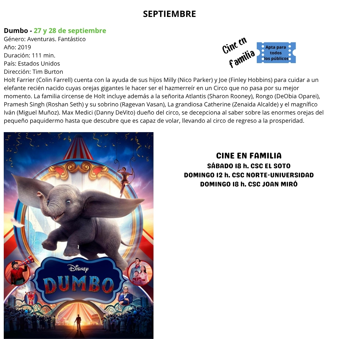 Y Cine en Familia ofrece esta semana la proyección "Dumbo" (2019), en el Centro Sociocultural El Soto, el sábado a las 18:00 h y el domingo, a las 12:00 h en el Centro Sociocultural Norte-Universidad, y a las 18:00 h, en el Centro Sociocultural Joan Miró. Un clásico de animación, versionada y dirigida por Tim Burton, para todos los públicos, al que se podrá asistir, de manera gratuita, previa retirada de invitaciones desde el lunes en el propio centro, de 10:00 h a 14:00 h y de 17:00 h a 20:00 h.