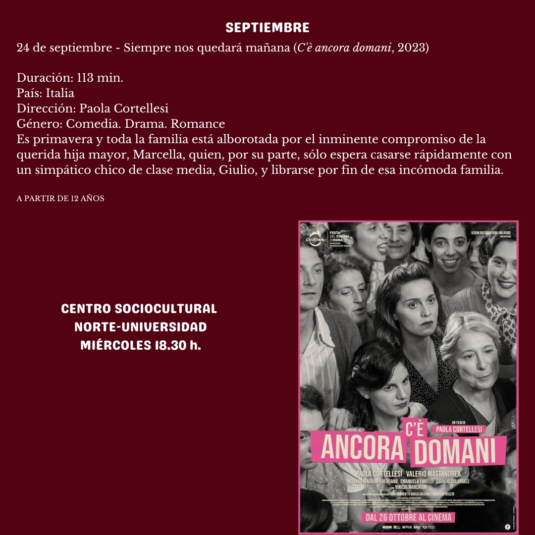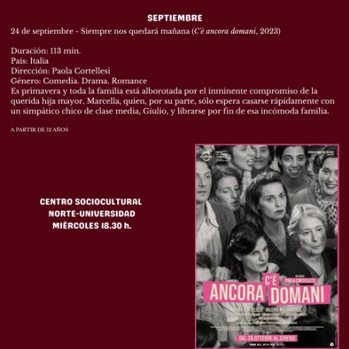 El miércoles 24, dentro del ciclo Filmoteca se proyectará la película "Siempre nos quedará mañana" (C'è ancora domani, 2023), a las 18:30 h, en el Centro Sociocultural Norte-Universidad. La entrada es gratuita, previa retirada de invitaciones en el propio centro.