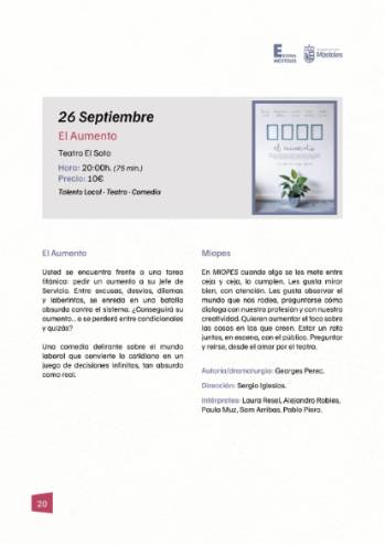 Dentro de la programación de la II Temporada de Escena Móstoles 2025, llega al Teatro El Soto la comedia "El aumento", a cargo de la compañía Miopes, el día 26, a las 20:00 h. La historia se centra en un empleado que quiere pedir un aumento a su Jefe de Servicio y, entre excusas y dilemas se enreda en una batalla absurda contra el sistema. Una comedia sobre el mundo laboral que convierte lo cotidiano en un juego de decisiones infinitas, tan absurdo como real.