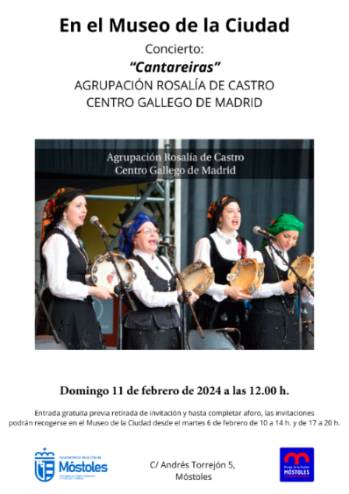 El Museo de la Ciudad de Móstoles acogerá el próximo día 11 de febrero, a las 12:00 h, la actuación de la Agrupación Artística Gallega "Rosalía de Castro", la agrupación folclórica más antigua de Madrid y una de las agrupaciones gallegas más antiguas de España, integrada sólo por aficionados.