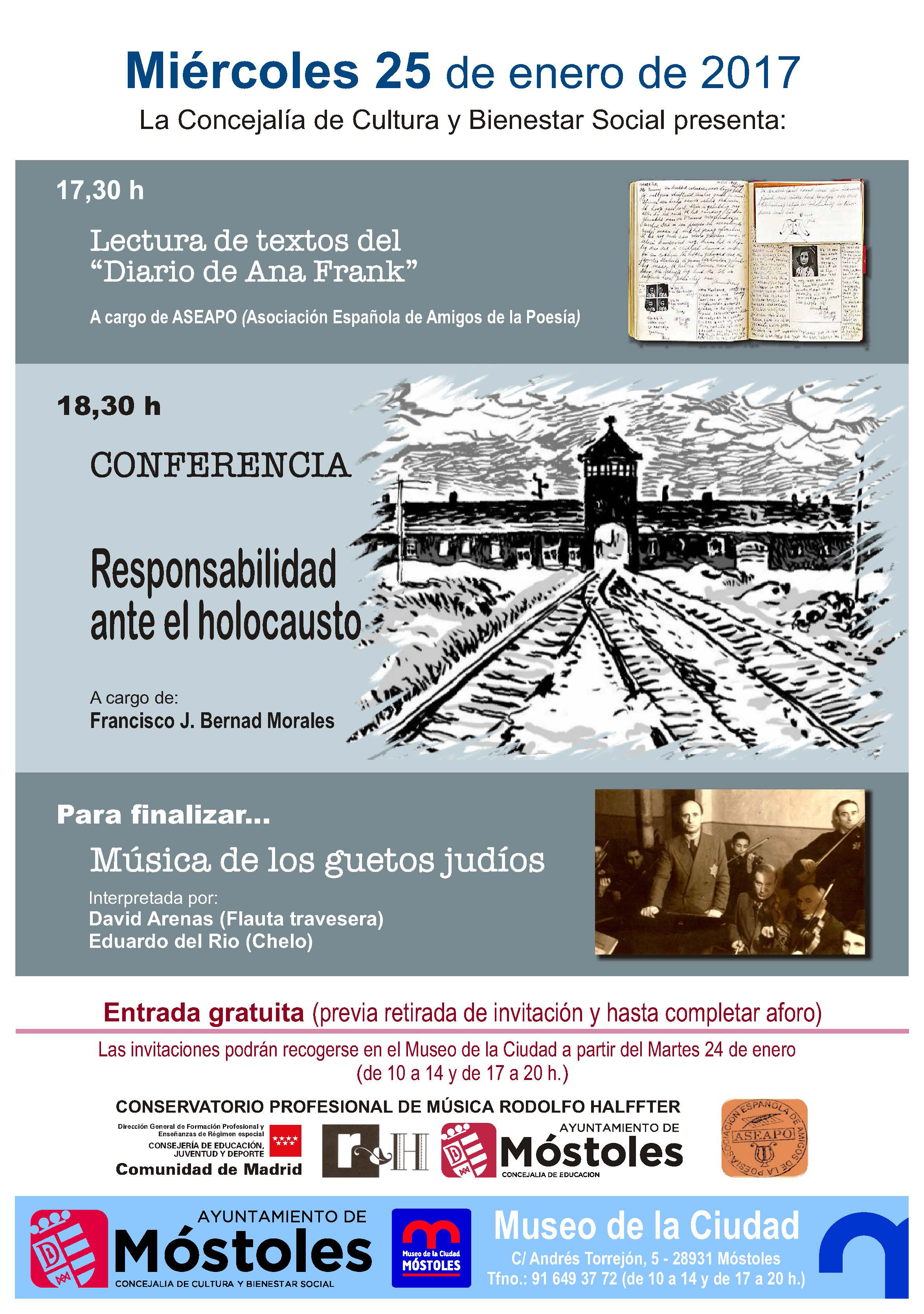 A partir de las 17.30 horas se va a desarrollar una lectura de párrafos del `Diario de Ana Frank´, interpretada por parte de la Asociación Española de Amigos de la Poesía (ASEAPO), y posteriormente, a las 19.30 horas, el historiador Francisco Javier Bernad Morales impartirá la conferencia, `Responsabilidad ante el Holocausto´.