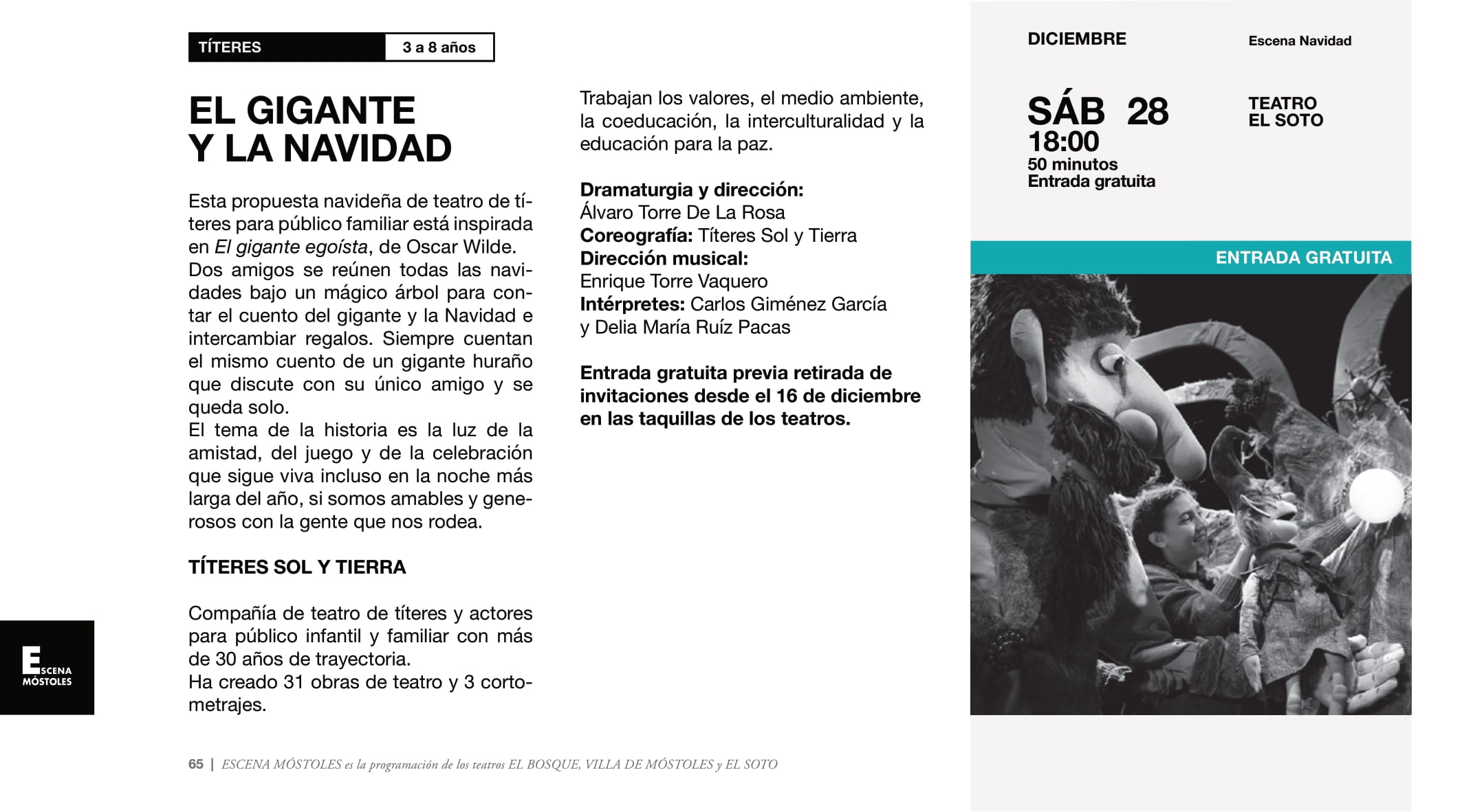El último sábado del año, el 28 de diciembre, la compañía Títeres Sol y Tierra llevará al Teatro El Soto la representación "El Gigante y la Navidad", a las 18:00 h, dirigido a niños de entre 3 y 8 años. Esta historia está inspirada en la obra "El gigante egoísta", de Óscar Wilde y que trata de la amistad y la generosidad con quienes nos rodean.