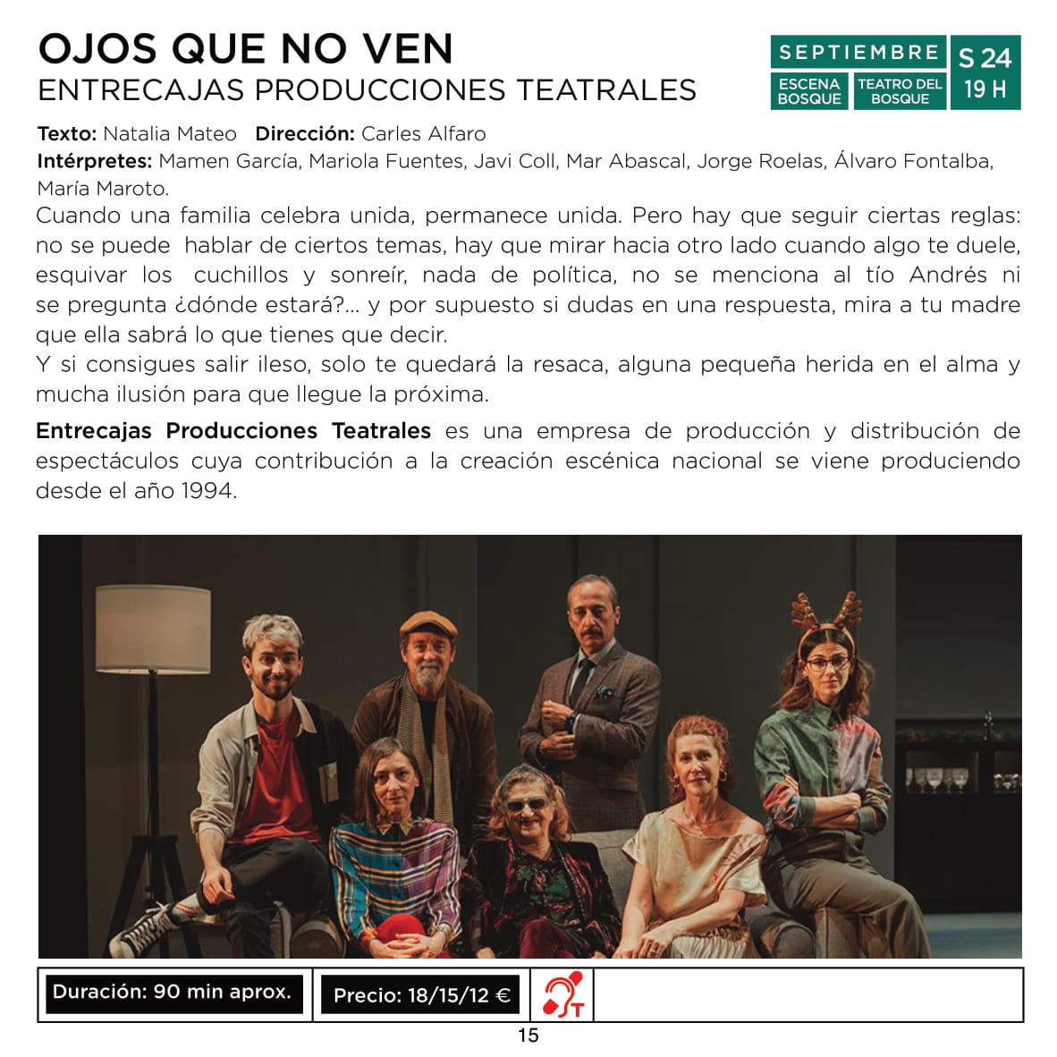 El sábado 24 de septiembre, también en el Teatro del Bosque y a las 19:00 h, se representará la obra "Ojos que no ven", de la compañía Entrecajas Producciones Teatrales, que dirige Carles Alfaro. Está interpretada por Mamen García, Mariola Fuentes, Javi Coll, Mar Abascal, Jorge Roelas, Álvaro Fontalba y María Maroto.