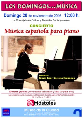 Imagen en alta resolución. Este enlace se abrirá mediante lightbox, puede haber un cambio de contextoLa Concejalía de Cultura y Bienestar Social, presenta en el Museo de la Ciudad, el domingo 20 de noviembre a las 12:00 horas el concierto "Música española para piano" interpretado por María Iciar Serrano Quiñones. En este concierto se interpretarán obras de Albéniz, Granados y Falla, entre otros compositores.