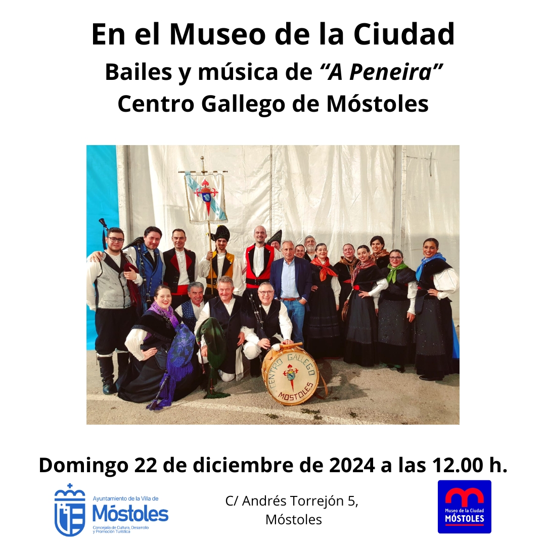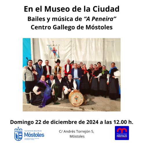 El domingo 22 de diciembre los amantes de la música y bailes regionales podrán disfrutar, en el Museo de la Ciudad, de la actuación del grupo gallego "A Peneira", a las 12:00 h. Un grupo formado en el año 1999 poco después de la creación del Centro Gallego de Móstoles, con la finalidad de divulgar la cultura gallega tanto en la Comunidad de Madrid como fuera de ella.
