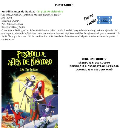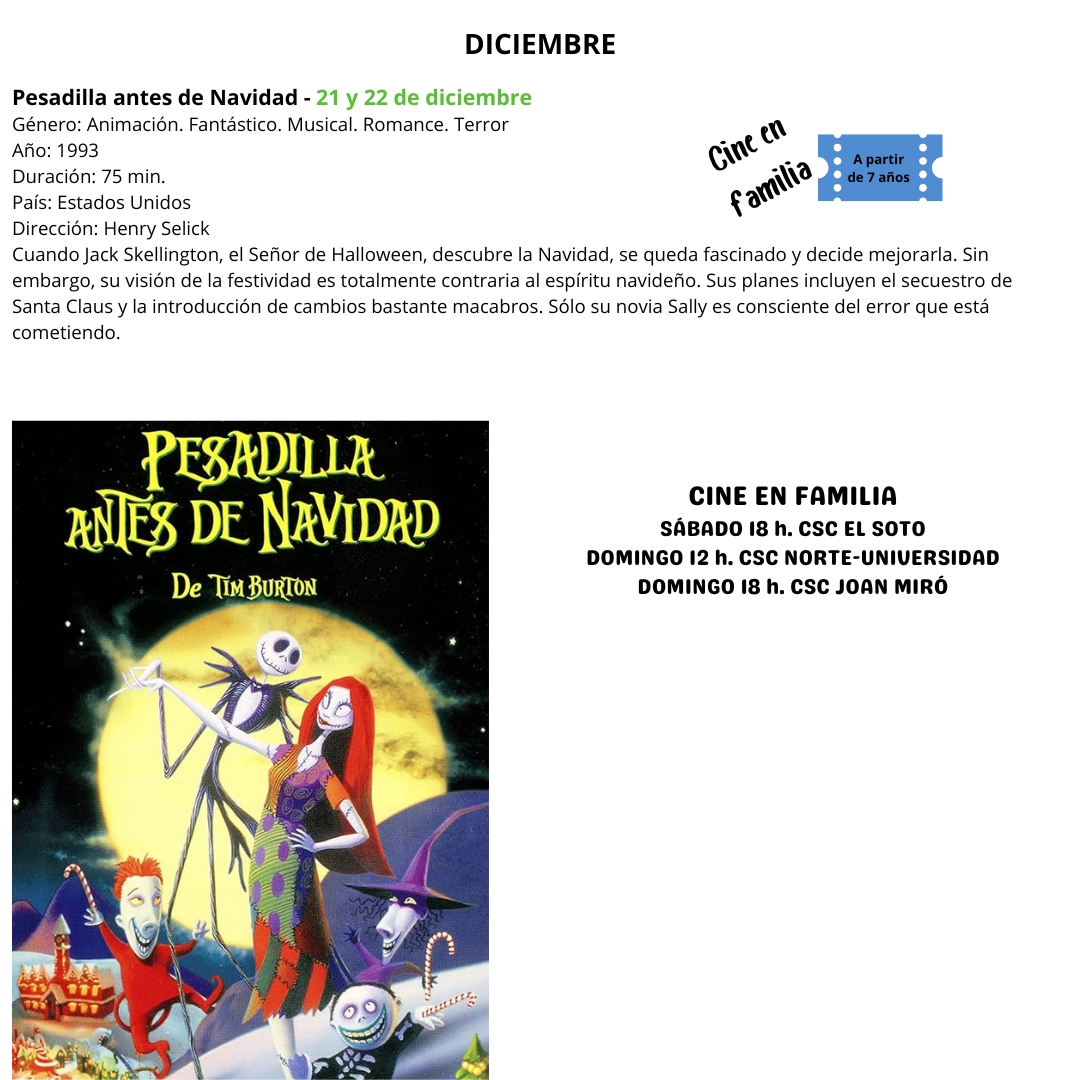 Dentro de la agenda cultural se puede seguir disfrutando de Cine en familia con la proyección de la película, muy navideña, como es "Pesadilla antes de Navidad", de Tim Burton. El protagonista Jack Skellington tras descubrir la Navidad quiere mejorarla de una manera muy peculiar como secuestrando a Santa Claus o elaborando otros planes contrarios al tradicional espíritu navideño. Su novia Sally intentará hacerle ver que se está equivocando. La película se podrá ver el sábado 21 de diciembre en el Centro Sociocultural El Soto, a las 18:00 h, y el domingo 22 de diciembre, a las 12:00 h, en el Centro Sociocultural Norte-Universidad, y a las 18:00 h, en el Centro Sociocultural Joan Miró.