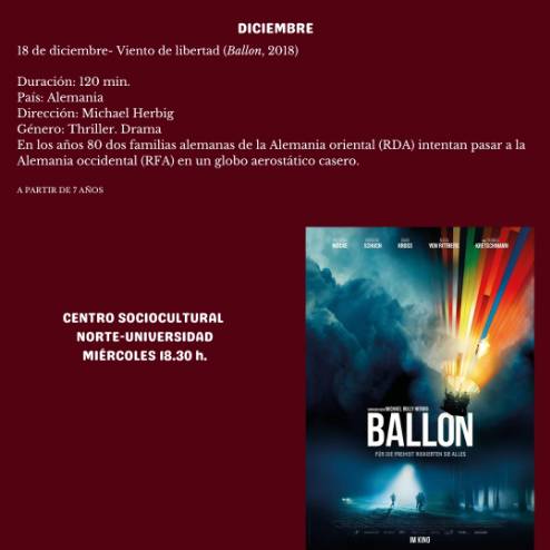 La película "Viento de libertad", se proyectará en el Centro Sociocultural Norte-Universidad, a las 18:30 h, en una nueva sesión del ciclo Filmoteca, un thriller de la Alemania de los años 80.