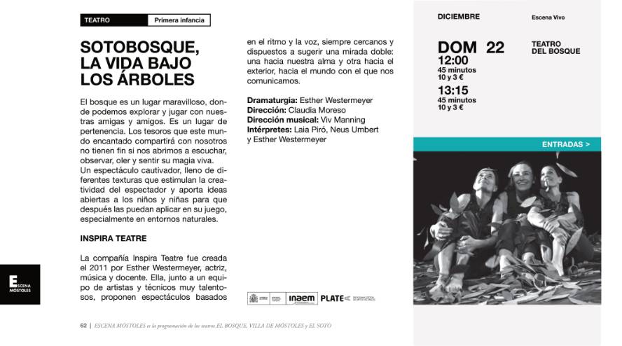 Y en el Teatro del Bosque, el domingo, a las 12:00 h y a las 13:15 h, llega "Sotobosque, la vida bajo los árboles", un espectáculo musical, visual y con movimiento para la primera infancia. La compañía Inspira Teatre, trae esta puesta en escena en la que el bosque es protagonista, un lugar de gran maravilla, donde poder explorar, escuchar y jugar con amigos que pueden ser plantas, árboles o incluso animales.