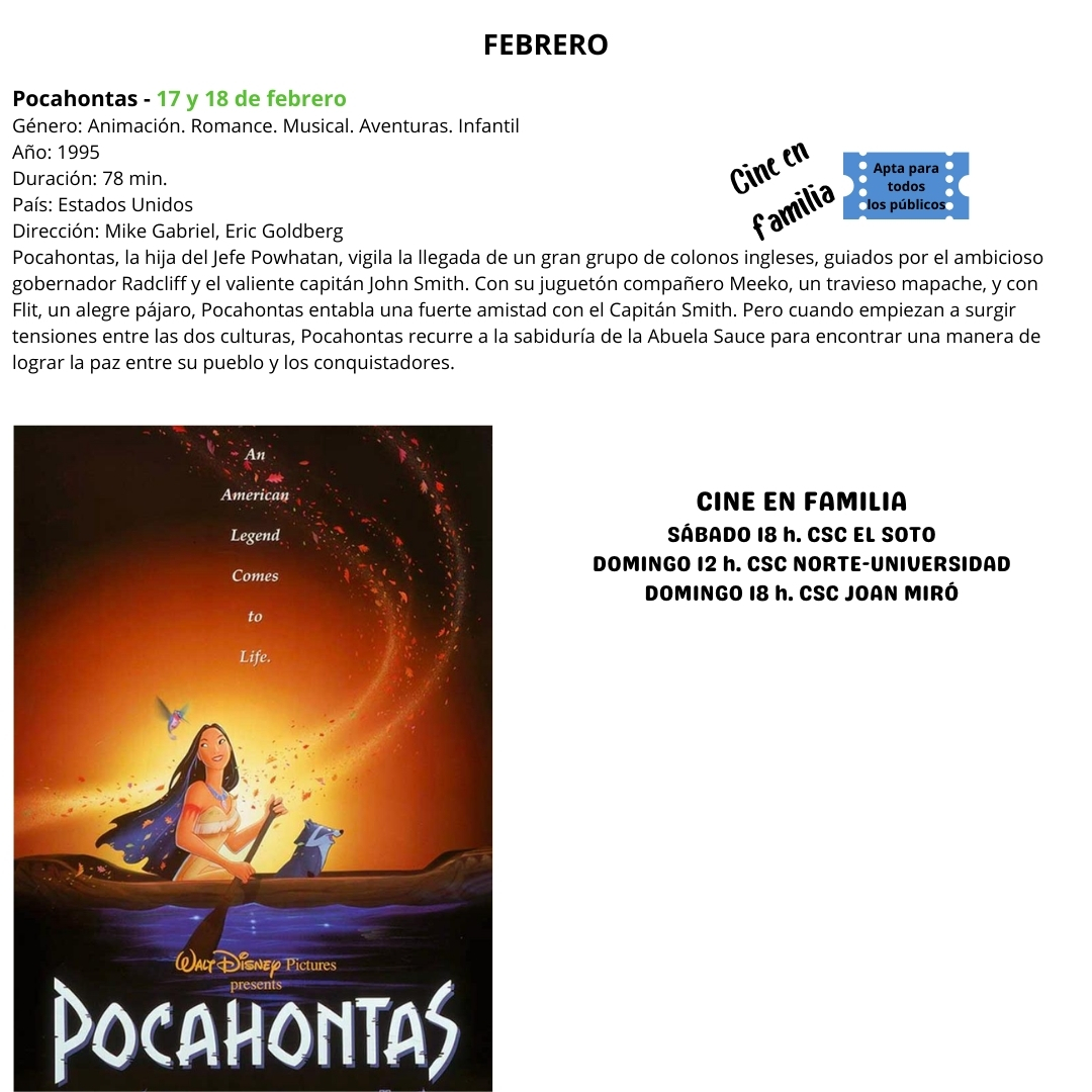 El mejor cine infantil llega el fin de semana de la mano de "Cine en Familia". La galardonada "Pocahontas" será la película que se proyecte en esta ocasión. Se podrá ver el sábado 17, a las 18:00 h, en el Centro Sociocultural El Soto y el domingo 18 a las 12:00 h en el Centro Sociocultural Norte-Universidad y a las 18:00 h en el Centro Sociocultural Joan Miró.