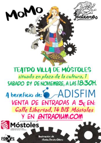 Imagen en alta resolución. Este enlace se abrirá mediante lightbox, puede haber un cambio de contextoEl próximo sábado 24 de noviembre, a las 18:30 horas, la Compañía "Teatreros", interpretará la obra para todos los públicos `Momo´, a beneficio de la labor que realiza en Móstoles la asociación ADISFIM. Las entradas, al precio de 5 euros, se pueden adquirir en la calle Libertad, 14 bis y en entradium.com. El acto contará con la colaboración de la Concejalía de Cultura, Bienestar Social y Vivienda.