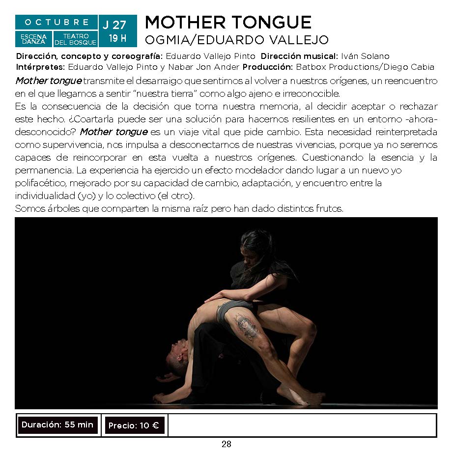 Dentro de la programación de Escena Móstoles, el jueves 27 a las 19:00 h en el Teatro del Bosque, se presentará el espectáculo de danza "Mother Tongue", con dirección y coreografía de Eduardo Vallejo.