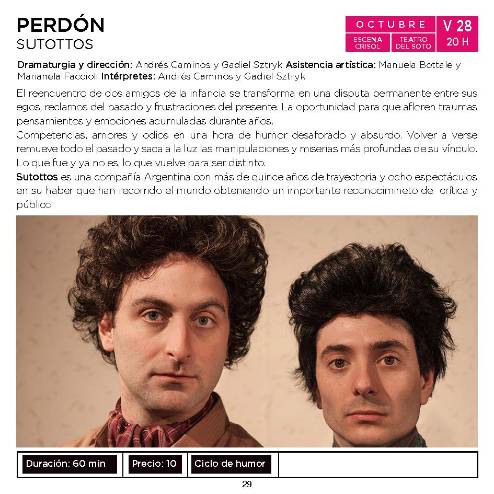 El viernes 28 de octubre a las 20:00 h en el Teatro del Soto se representará "Perdón", con dramaturgia, dirección e interpretación de Andrés Caminos y Gadiel Sztryk.
