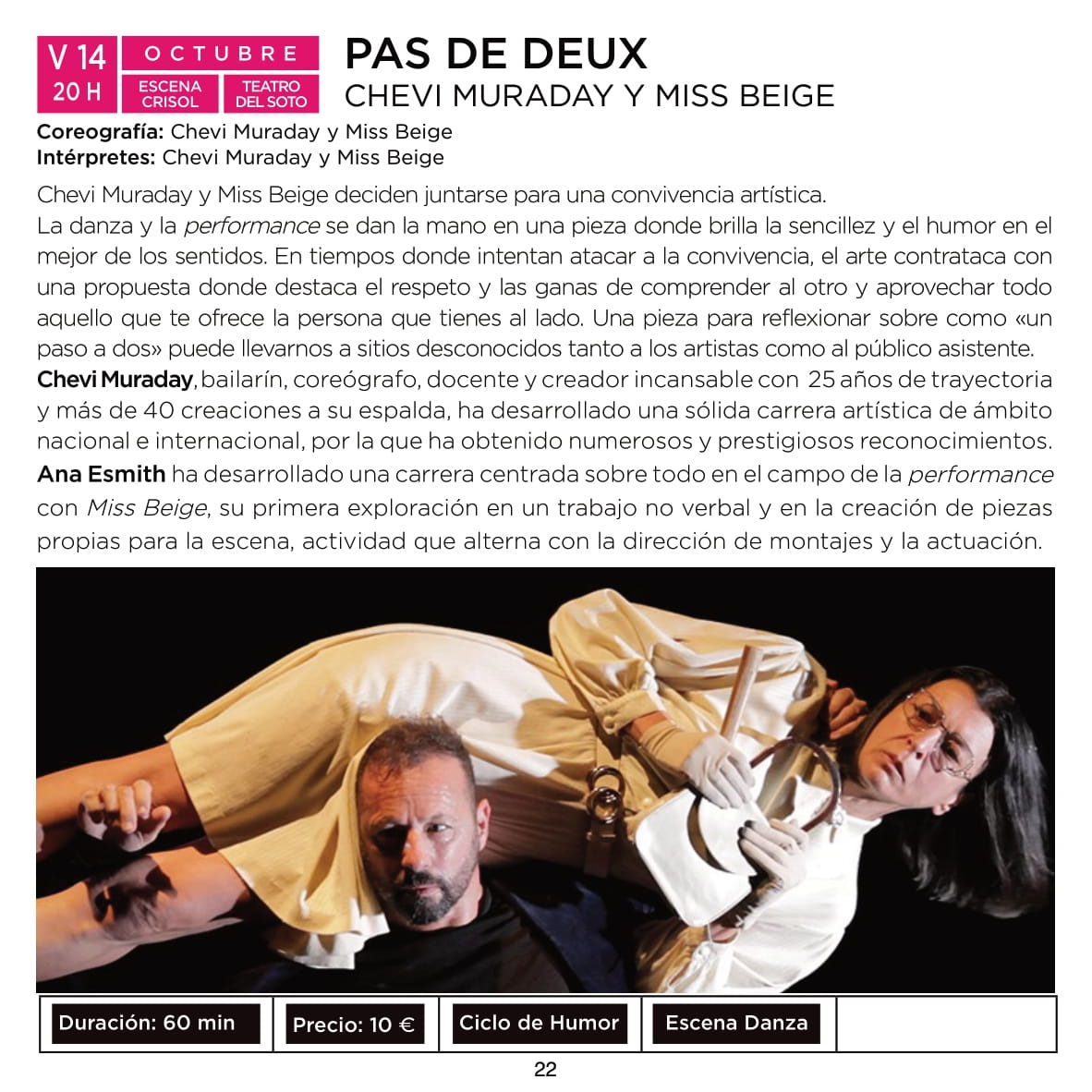 Dentro de la programación de Escena Móstoles, el viernes 14 a las 20:00 h en el Teatro del Soto, se presentará "Pas de Deux", donde Chevi Muraday y Miss Beige deciden juntarse en un espectáculo de danza y performance en el que brilla la sencillez y el humor en el mejor de los sentidos.