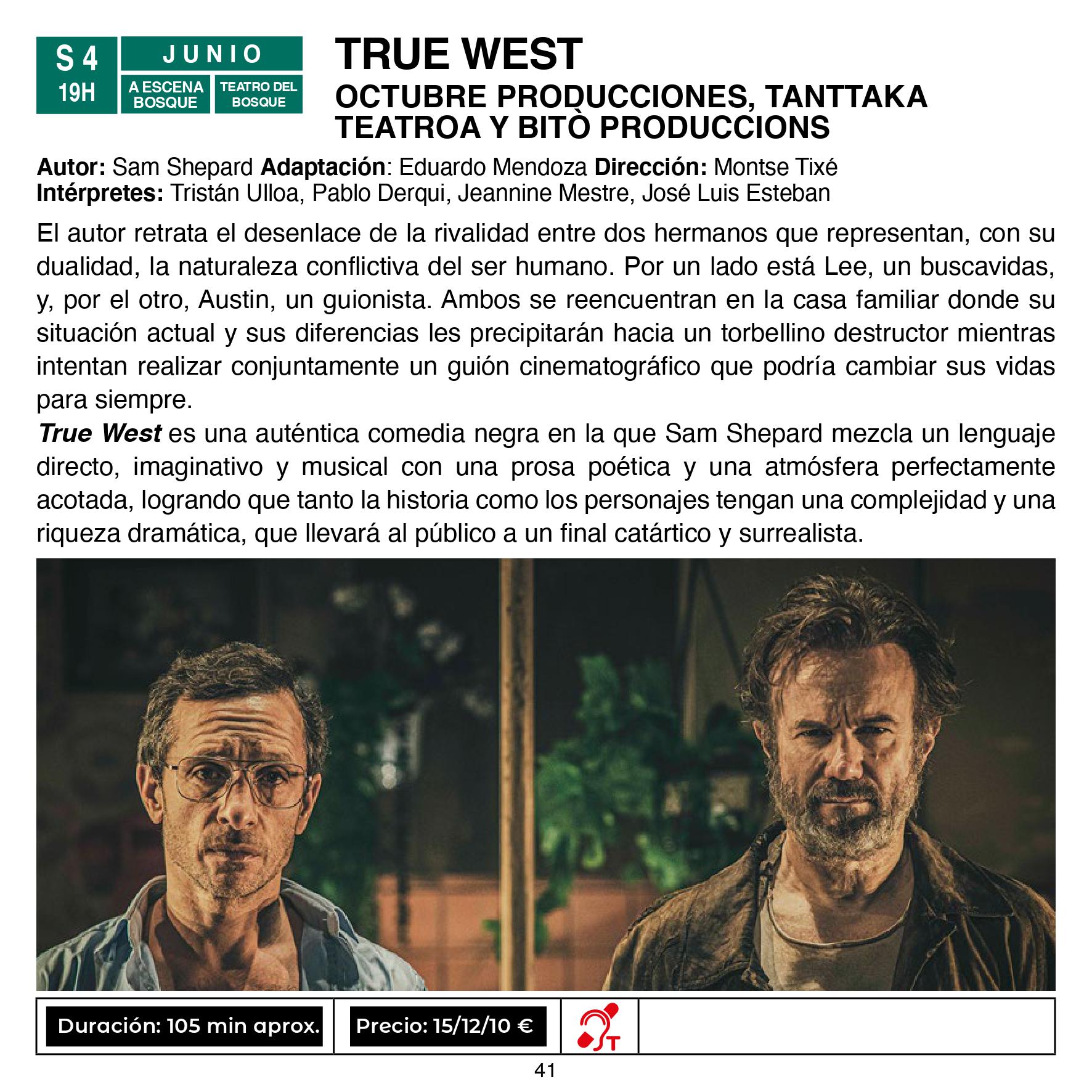 A Escena ofrecerá, este sábado 4, a las 19:00 h, en el Teatro del Bosque, la obra True West. Una auténtica comedia negra en la que Sam Shepard mezclando un lenguaje directo, imaginativo y musical con una prosa poética y una atmósfera perfectamente acotada hace que tanto la historia como los personajes tengan una complejidad y una riqueza dramática, que llevará al público a un final catártico y surrealista.
