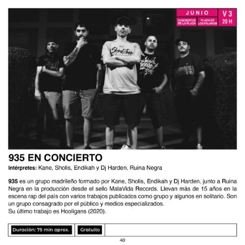 Los conciertos continuarán el viernes 3, a las 20:00 h, en la Plaza de los Pájaros. Allí el grupo madrileño 935 ofrecerá un concierto de música rap. Se trata de un grupo ya consagrado por el público y medios especializados y cuyo último trabajo es Hooligans (2020).