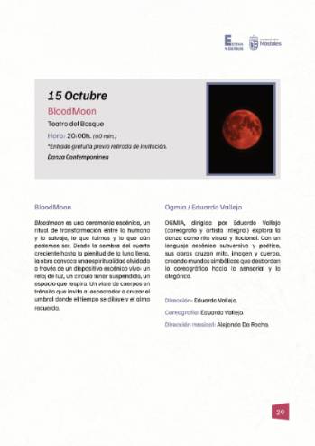También llega al Teatro del Bosque una propuesta de danza contemporánea, "BloodMoon", a cargo de la compañía Ogmia, dirigida por Eduardo Vallejo, a las 20:00 h. La entrada es gratuita y la retirada de invitaciones se puede realizar en los teatros y online.