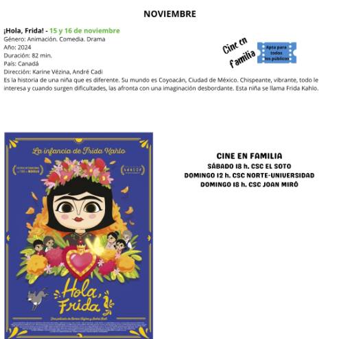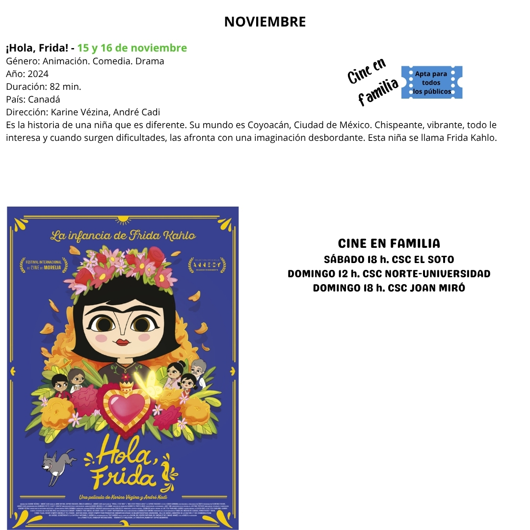 El fin de semana los más pequeños tienen una cita con el mejor cine infantil que trae el programa "Cine en Familia". La película de esta semana será "¡Hola, Frida!", que se podrá ver el sábado 15, a las 18:00 h, en el Centro Sociocultural El Soto y el domingo 16 a las 12:00 h en el Centro Sociocultural Norte-Universidad y a las 18:00 h en el Centro Sociocultural Joan Miró.