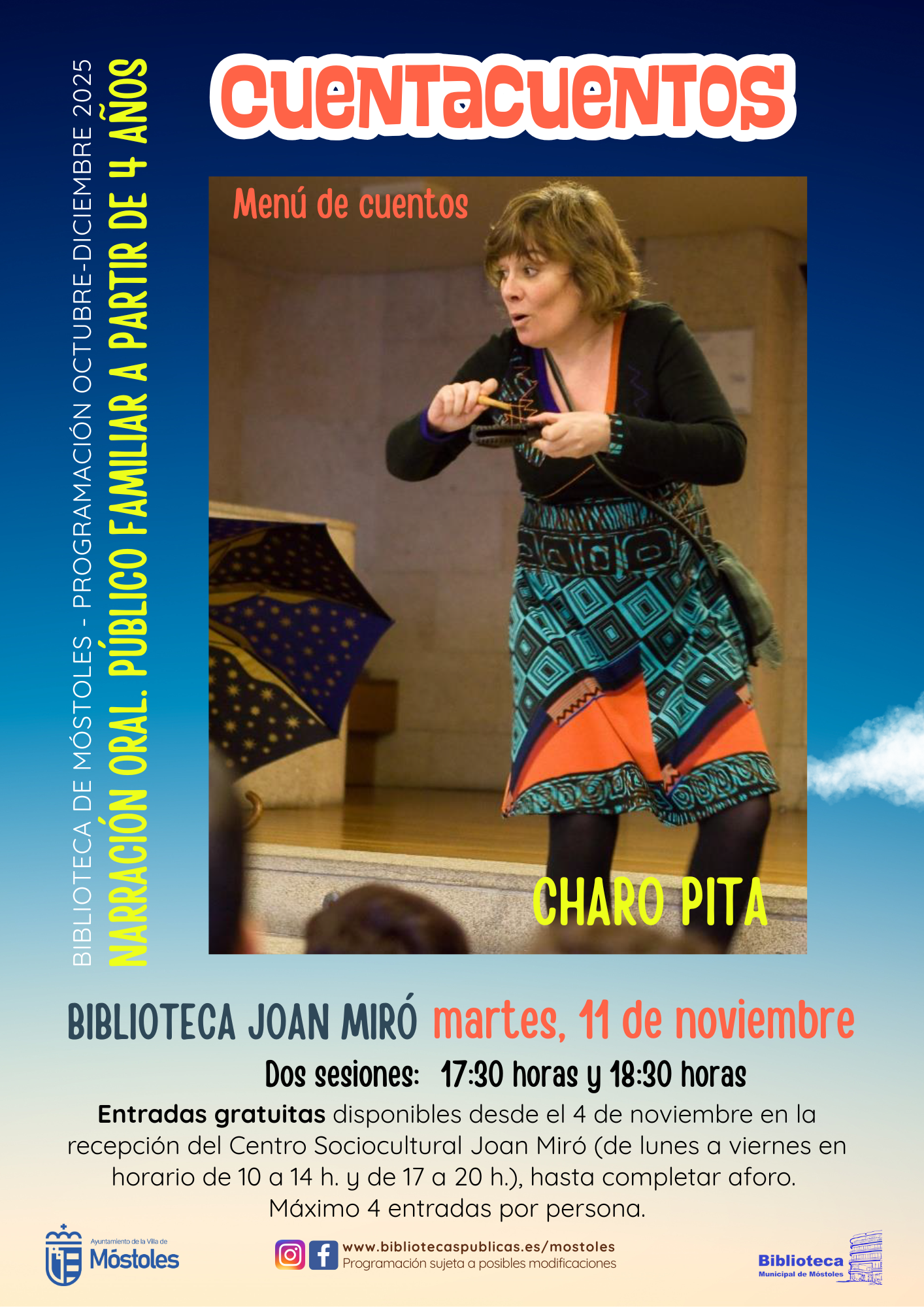 La agenda cultural, diseñada por el Ayuntamiento de Móstoles, a través de la Concejalía de Cultura, Desarrollo y Promoción Turística, comienza con "Menú de cuentos", cuentacuentos que narrará Charo Pita el martes 11 en el Centro Sociocultural Joan Miró. Habrá dos sesiones: a las 17:30 h y a las 18:30 h.