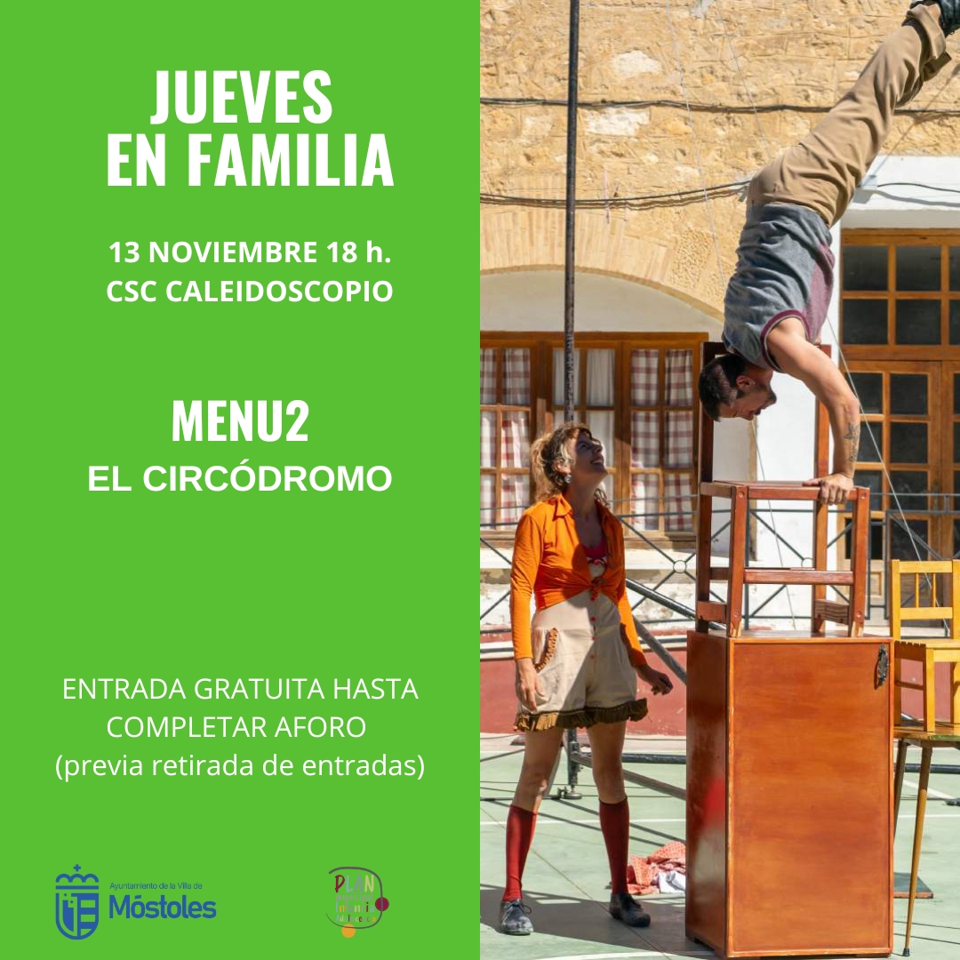 Dentro del programa "Jueves en Familia", la compañía El Circódromo trae "Menu2", un espectáculo familiar que mezcla humor absurdo con acrobacias de circo, malabares y trapecio, generando sketches divertidos. El show será el jueves 13 a las 18:00 h en el Centro Sociocultural Caleidoscopio.