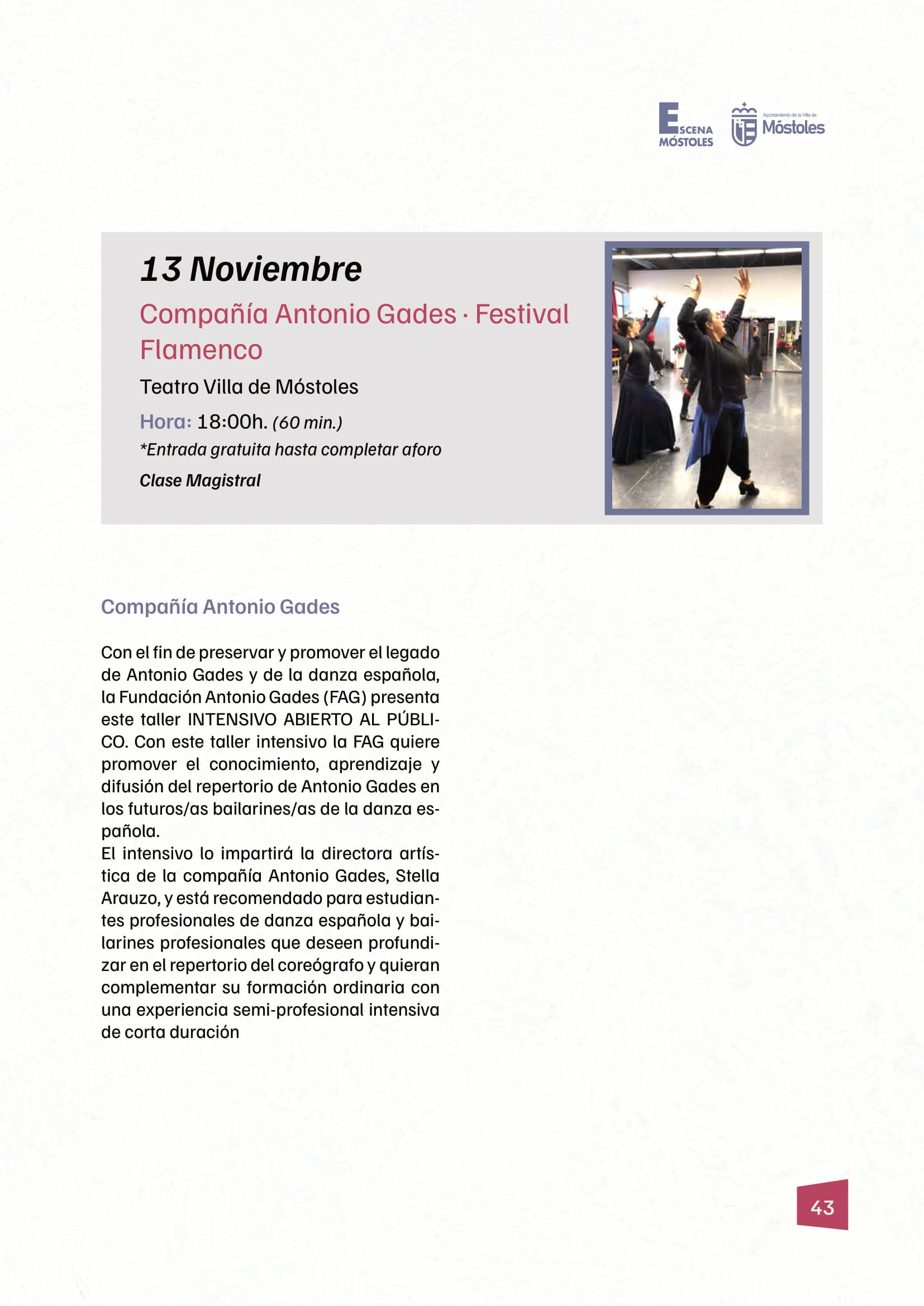 La Fundación Antonio Gades (FAG) organiza una clase magistral abierta al público el jueves 13, a las 18:00 h, en el Teatro Villa de Móstoles, dentro del II Festival Flamenco. Esta iniciativa busca fomentar el conocimiento, aprendizaje y transmisión del repertorio de Gades entre las nuevas generaciones de bailarines de danza española.