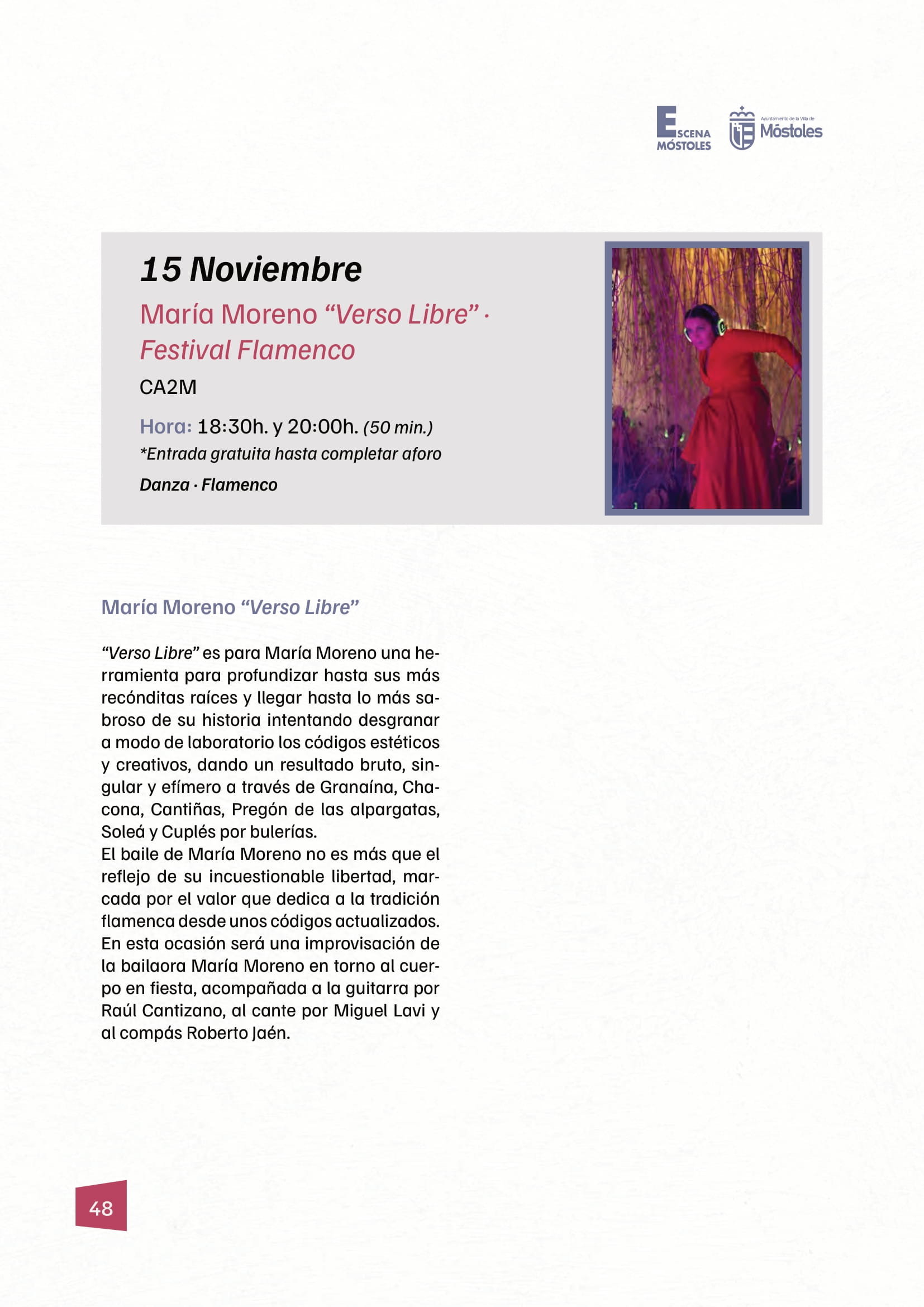 Más tarde, a las 18:30 h y 20:00 h, en el Centro de Arte Dos de Mayo, María Moreno presentará su "Verso libre", una obra-laboratorio que indaga en las raíces del flamenco para descomponer sus códigos estéticos y creativos. El resultado es un espectáculo único y efímero, articulado a través de Granaína, Chacona, Cantiñas, Pregón de las alpargatas, Soleá y Cuplés por bulerías.