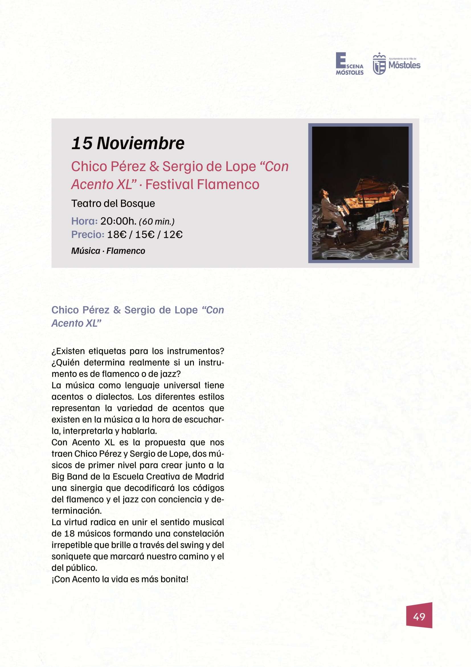 A las 20:00 h, en el Teatro del Bosque, Chico Pérez y Sergio de Lope, junto a la Mérida Big Band, interpretarán "Acento XL", una fusión consciente entre flamenco y jazz. La combinación de 18 músicos crea una constelación sonora singular, guiada por el swing y el soniquete, que conduce al público a una experiencia sonora única.