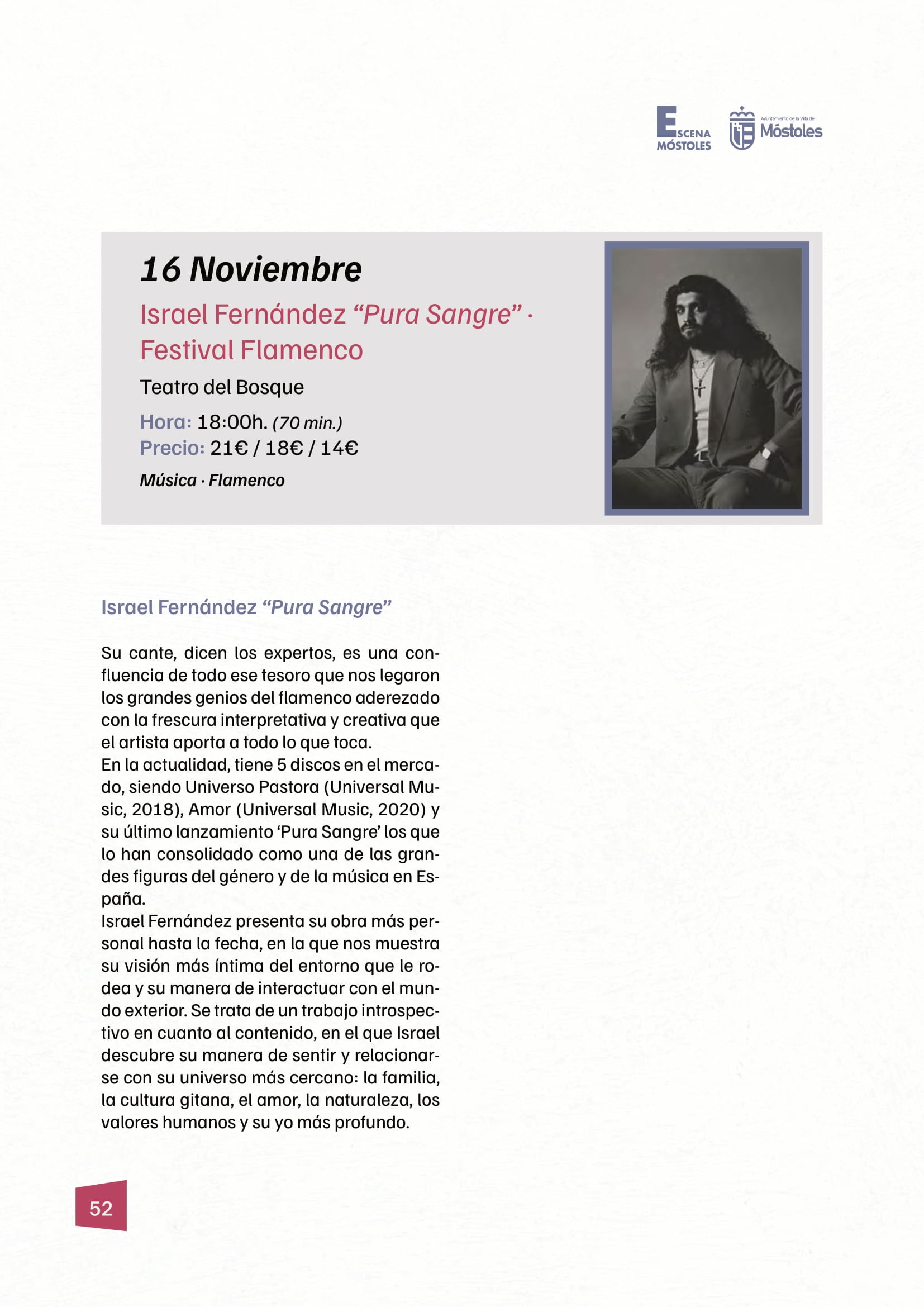 El festival concluirá, y también la agenda cultural, con la actuación del cantaor Israel Fernández, que presentará su espectáculo "Pura Sangre" el domingo 16, a las 18:00 h, en el Teatro del Bosque.