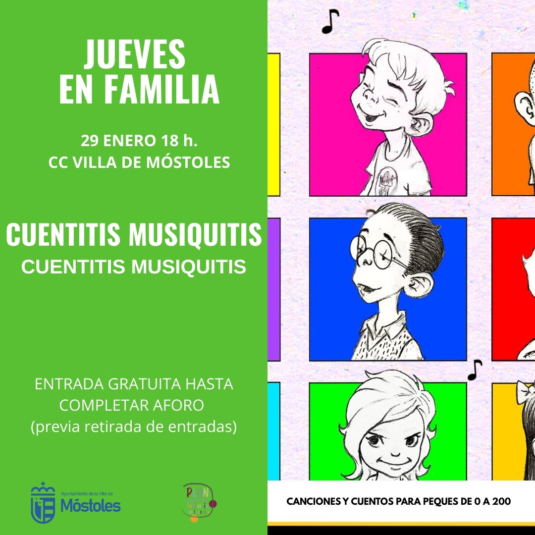 Dentro de "Jueves en Familia", el Centro Cultural Villa de Móstoles acoge el jueves 29, a las 18:00 h, "Cuentitis Musiquitis", espectáculo de música y humor para niños de 3 a 10 años (y adultos con alma de niño), protagonizado por canciones que se cuentan y cuentos que se cantan.