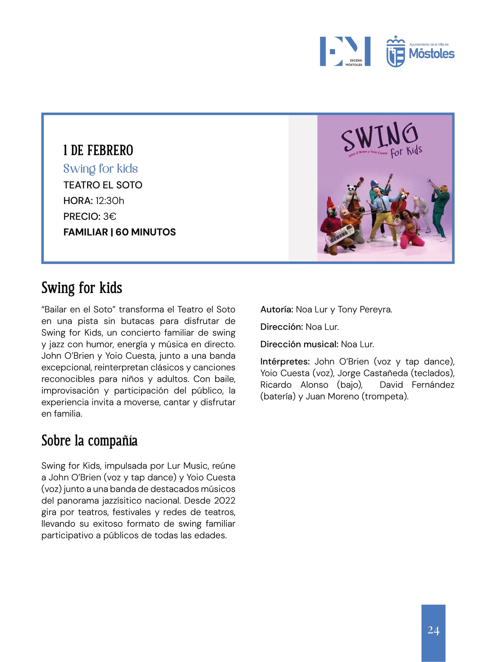 También el domingo 1, a las 12:30 h, "Bailar en el Soto" transforma el Teatro el Soto en una pista sin butacas para disfrutar de Swing for Kids, un concierto familiar de swing y jazz con humor, energía y música en directo. John O’Brien y Yoio Cuesta, junto a una banda excepcional, reinterpretan clásicos y canciones reconocibles para niños y adultos. Con baile, improvisación y participación del público, la experiencia invita a moverse, cantar y disfrutar en familia.
