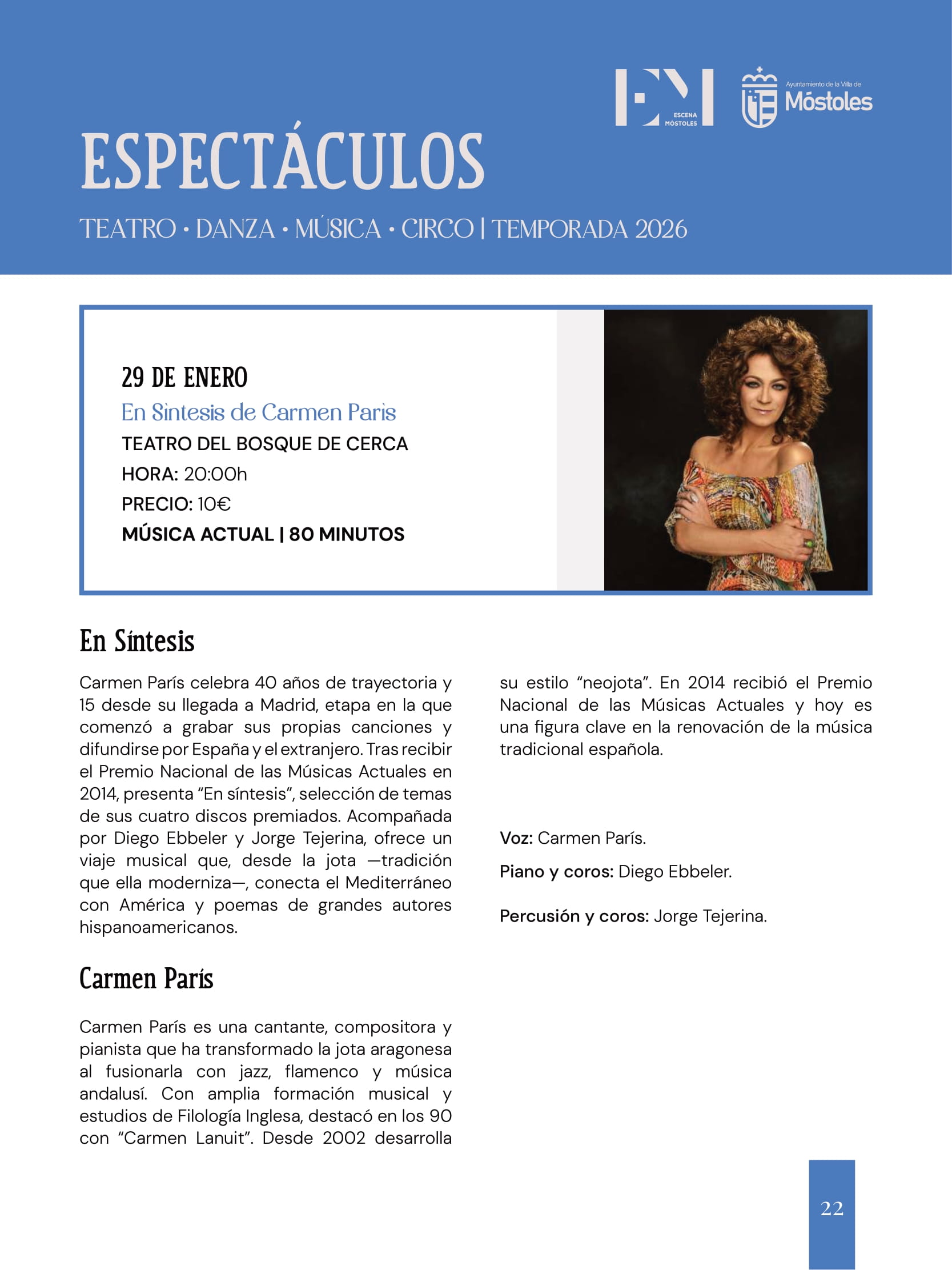 Carmen París celebra 40 años de trayectoria y 15 desde su llegada a Madrid, etapa en la que comenzó a grabar sus propias canciones y difundirse por España y el extranjero. Tras recibir el Premio Nacional de las Músicas Actuales en 2014, presenta "En síntesis", selección de temas de sus cuatro discos premiados. Acompañada por Diego Ebbeler y Jorge Tejerina, ofrece un viaje musical que, desde la jota, conecta el Mediterráneo con América y poemas de grandes autores hispanoamericanos.