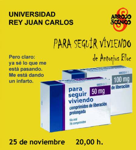 Imagen en alta resolución. Este enlace se abrirá mediante lightbox, puede haber un cambio de contextoLa XV Muestra de Teatro Universitario de Móstoles se cierra este viernes 25 de noviembre con la obra "Para seguir viviendo", escrita por Antonius Bloc, interpretada por el grupo ArrojoScénico perteneciente a la Universidad Rey Juan Carlos y dirigida por Víctor Mendoza.