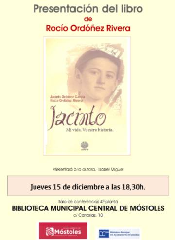 PRESENTACIÓN DEL LIBRO de Rocío OrdoñezImagen en alta resolución. Este enlace se abrirá mediante lightbox, puede haber un cambio de contextoPRESENTACIÓN DEL LIBRO de Rocío OrdoñezLa Biblioteca Municipal Central de Móstoles ofrecerá, el próximo 15 de diciembre a las 18:30 horas, la presentación de la obra "Jacinto. Mi vida. Vuestra historia" de la escritora Rocío Ordónez. La lectura de fragmentos estará a cargo de los poetas de Móstoles, acompañados por el músico Esau Reguilón al violonchelo, Emilio Polo Vilches, Rosa Rodriguez, Antonio J. Sánchez, Mariana Feride, Primitivo Oliva, Rocío Ordóñez, Conchi Pascua Gondín y Susana Ordóñez