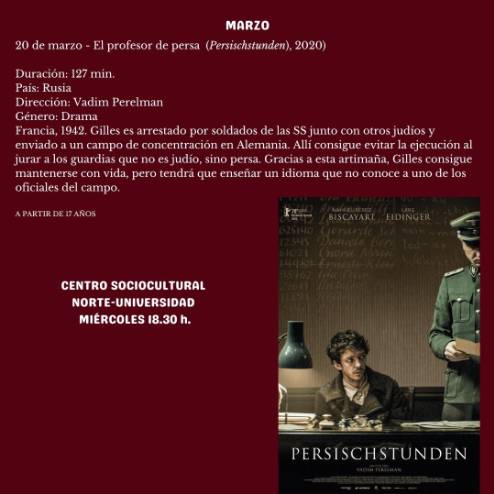Enmarcado en el programa Filmoteca, el Centro Sociocultural Norte-Universidad proyectará el miércoles 20, a las 18:30 h, la película rusa "El profesor de persa". Esta cinta de 2020 nos sitúa en la Francia de 1942, donde Gilles es enviado a un campo de concentración en Alemania junto a otros judíos. Para evitar ser ejecutado, convence a los guardias de que no es judío, sino persa. Así, consigue mantenerse con vida, pero deberá desempeñarse como profesor de persa.