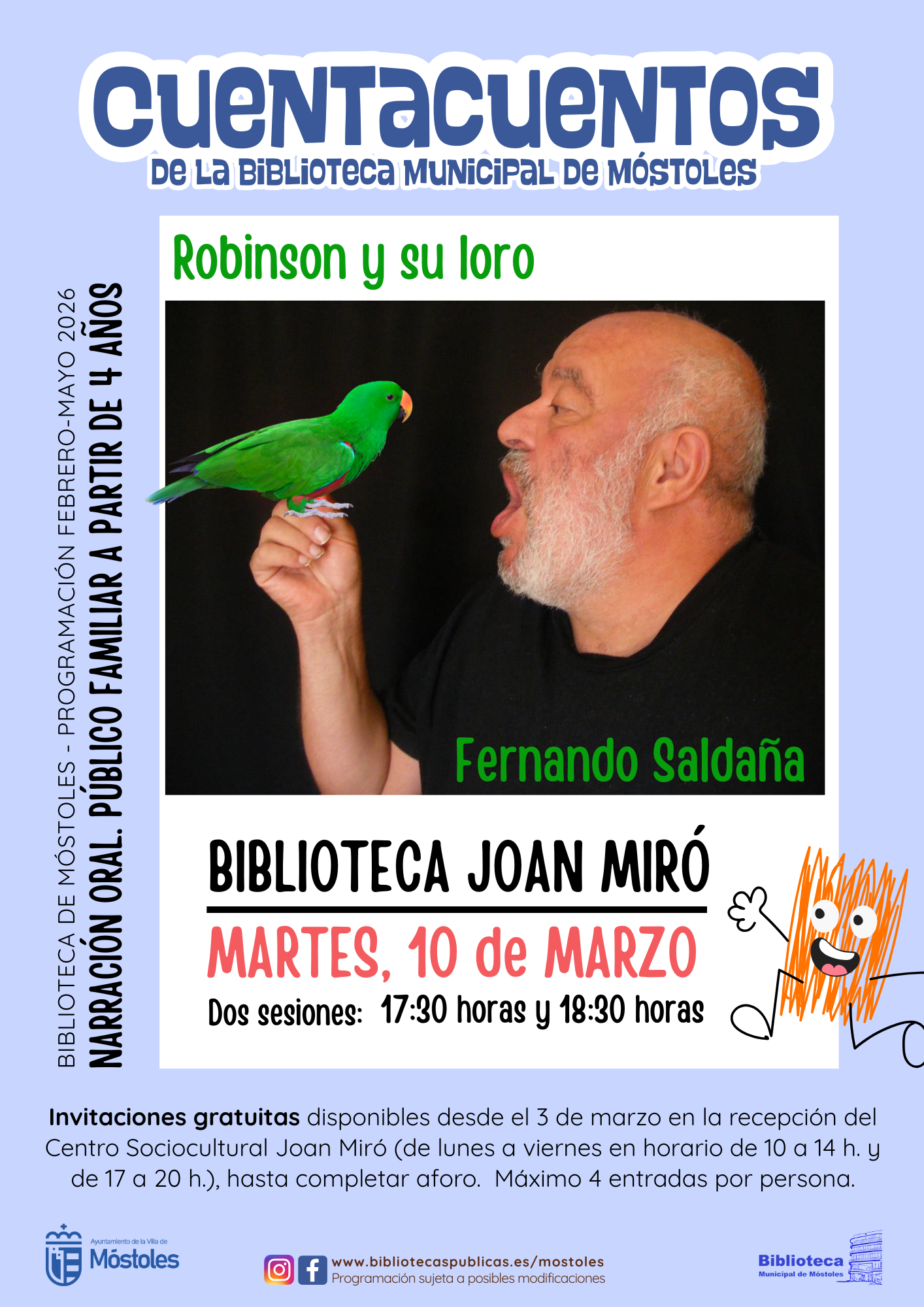 El martes 10 el cuentacuentos "Robinson y su loro", que tendrá como narrador a Fernando Saldaña, llega a la biblioteca del Centro Sociocultural Joan Miró, en dos sesiones de 30 minutos, a las 17:30 h y a las 18:30 h, dirigido a niños a partir de cuatro años. La historia tiene como protagonista a un marinero que tiene que enfrentarse a una terrible tormenta que le hace naufragar, pero consigue llegar a una isla en la que se encontrará con un loro que le ayudará a encontrar la forma de regresar a casa. Este cuentacuentos también podrá disfrutarse en la Biblioteca Parque Coimbra el miércoles 11, a las 17:30 h y a las 18:30 h. Para ambos, la entrada es gratuita previa retirada de invitaciones en la recepción del propio centro de 10:00 h a 14:00 h y de 17:00 h a 20:00 h.