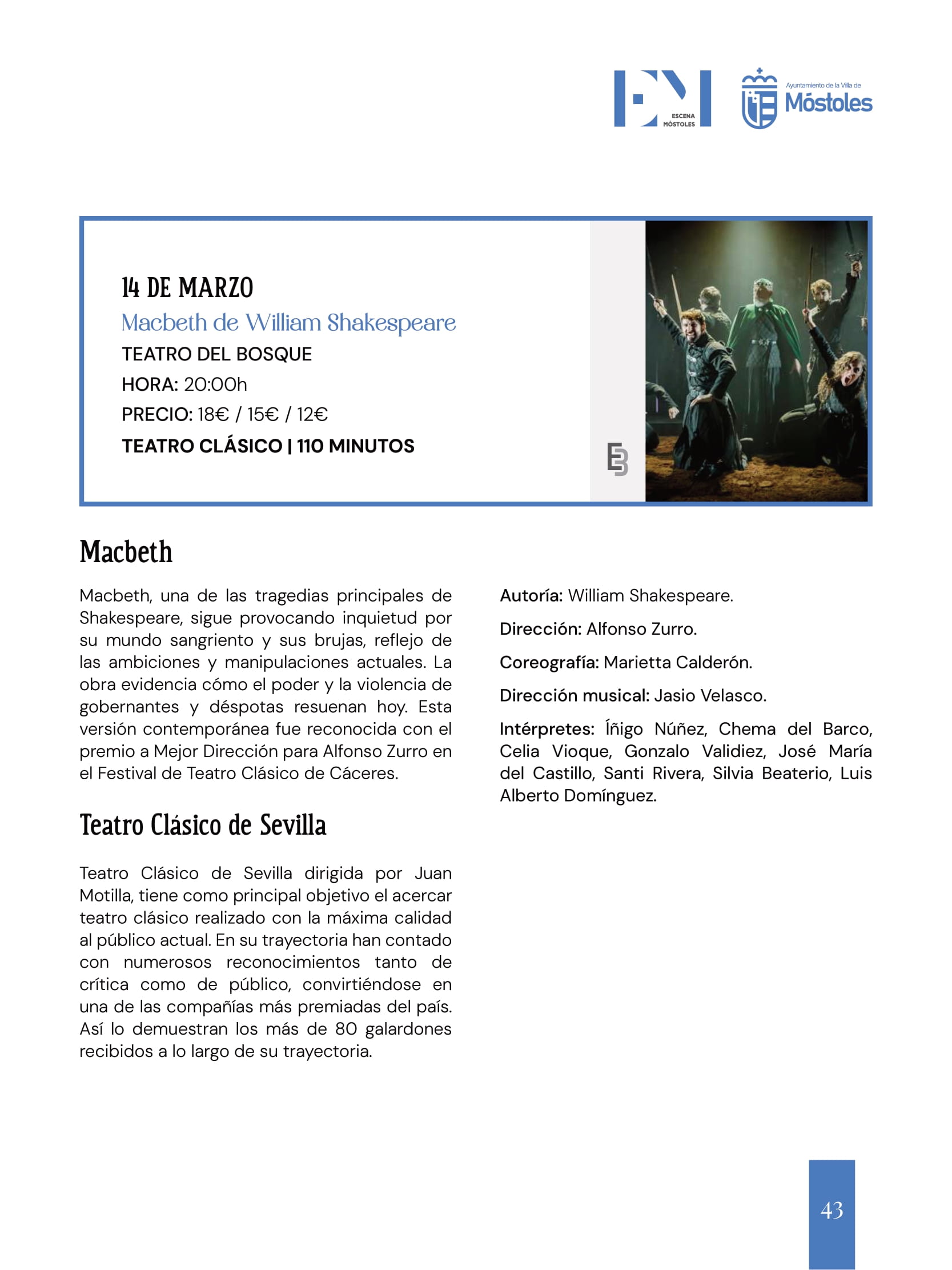 El sábado 14 una de las obras icónicas de Shakespeare, la tragedia de "Macbeth", se podrá ver sobre las tablas del Teatro del Bosque, a cargo del Teatro Clásico de Sevilla, a las 20:00 h. Esta versión contemporánea trae la historia de cómo unas brujas vaticinan a Macbeth que será rey y después se desvanecen en el aire. A partir de ese momento el protagonista ve su imaginación desbocada donde sus fantasías, alentadas por su esposa, Lady Macbeth, se desbordan. Los Macbeth son capaces de romper con la realidad, el tiempo, y lanzarse a las tinieblas. Un descenso a los infiernos que hará descubrirnos a nosotros mismos.