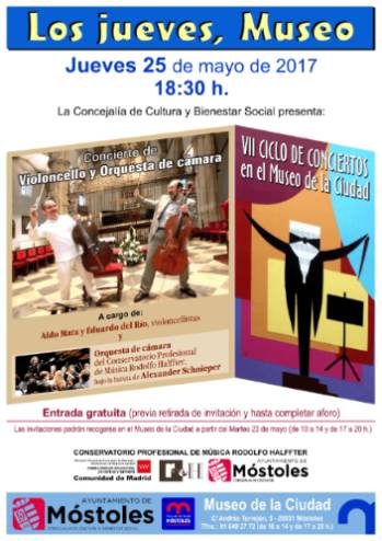 Se trata de una actividad organizada por la Concejalía de Cultura y Bienestar Social, en colaboración con el Conservatorio y el Museo de la Ciudad, en la que, en una primera parte, los cellistas Aldo Mata y Eduardo del Río ofrecerán un concierto con obras para dos violoncellos de Boccherini, Offenbach y del Río.