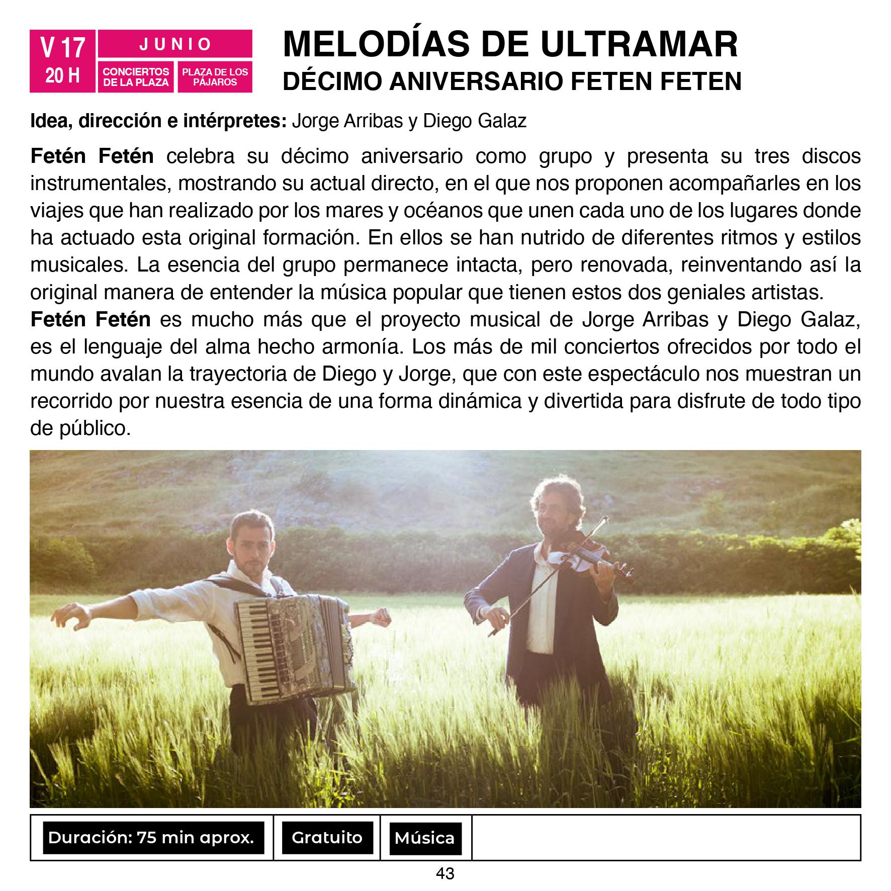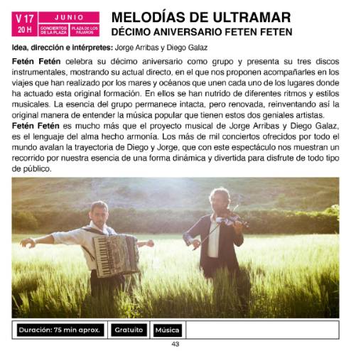 La programación de Conciertos de la Plaza, dentro del Programa de A Escena, ofrecerá en la Plaza de los Pájaros a las 20:00 h, "Melodías de Ultramar", a cargo de la compañía Fetén Fetén, en su décimo aniversario.Dirigida e interpretadaporJorge Arribas y Diego Galaz, Fetén Fetén presenta sus tres discos instrumentales, mostrando su actual directo, en el que nos proponen acompañarles en los viajes que han realizado por los mares y océanos que unen cada uno de los lugares donde ha actuado esta original formación.