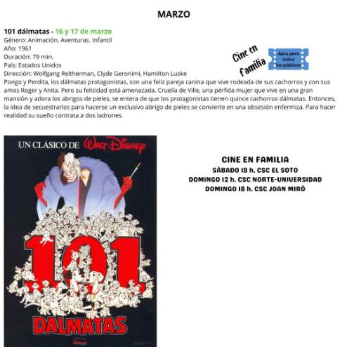 CINE EN FAMILIA. Programa organizado para ver en familia esas películas de siempre de nuevo con los hijos, pero esta vez en pantalla grande. En el Centro Sociocultural El Soto, a las 18 horas.
