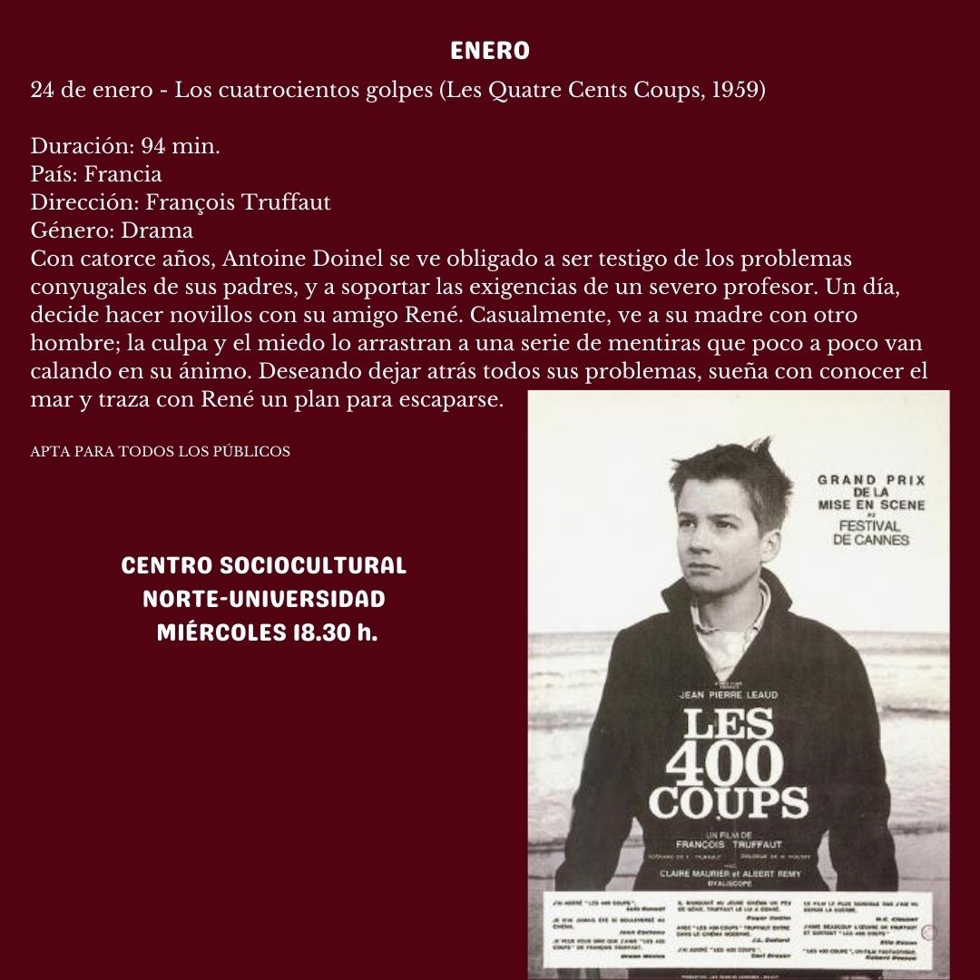 (Les 400 Coups), 1959, 94 min. Francia. Director: François Truffaut. Drama. Sinopsis: Con sólo catorce años, Antoine Doinel se ve obligado no sólo a ser testigo de los problemas conyugales de sus padres, sino también a soportar las exigencias de un severo profesor. Un día, asustado porque no ha cumplido un castigo impuesto por el maestro, decide hacer novillos con su amigo René.