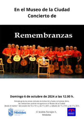 El concierto de la Agrupación Musical de folclore "Remembranzas", tendrá lugar el domingo 6 de octubre, a las 12:00 h. Creada en 1998 y fundada por personas amantes de la música de pulso y púa, esta formación musical realiza actuaciones en centros culturales, teatros, centros de mayores, centros educativos, casas regionales y otros espacios de Móstoles y otras localidades ofreciendo un repertorio de canciones muy extenso y variado.