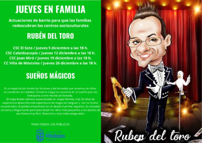 El mago local Rubén del Toro será el protagonista de la programación Jueves en Familia, organizada por el Ayuntamiento de Móstoles, a través de la Concejalía de Cultura, Desarrollo y Promoción Turística, para el mes de diciembre.