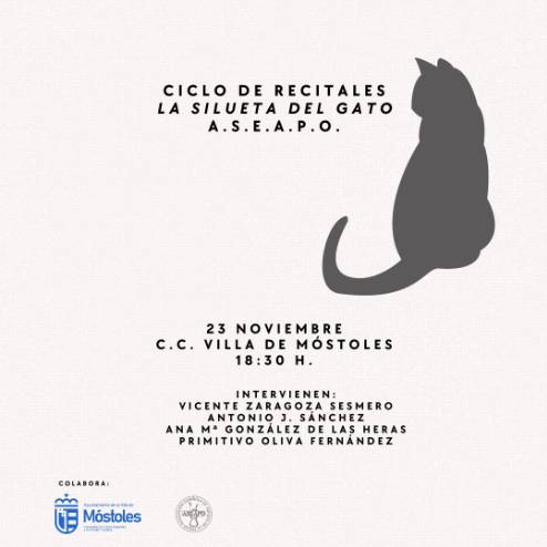 • La Concejalía de Cultura, Desarrollo y Promoción Turística, en colaboración con ASEAPO pondrán en marcha en noviembre el Ciclo "Versos en el hall". La iniciativa arrancará en el Centro Cultural Villa de Móstoles, el 23 de noviembre, de 18:30 a 19:30 horas, con el recital "La silueta del gato".