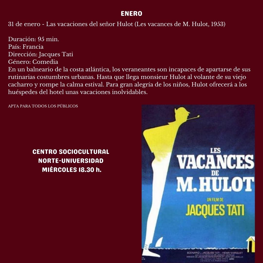 Las vacaciones del Sr. Hulot (Les vacances de M. Hulot). 1953. 95 min. Francia. Director: Jacques Tati. Comedia. Sinopsis: En un balneario de la costa atlántica, los veraneantes son incapaces de apartarse de sus rutinarias costumbres urbanas. Hasta que llega monsieur Hulot al volante de su viejo cacharro y rompe la calma estival.