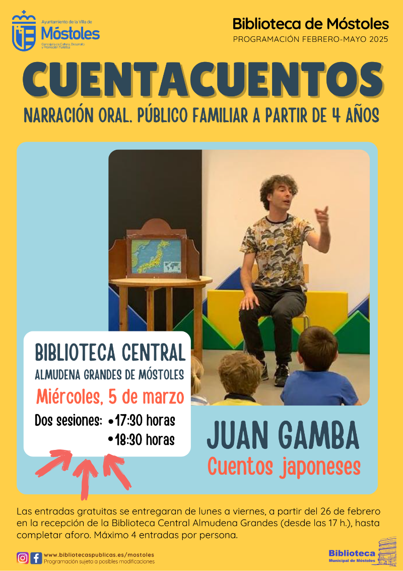 "Cuentos japoneses", cuentacuentos a cargo de Juan Gamba, en la Biblioteca Central a las 17:30 y 18:30 horas (2 sesiones de 30 minutos). A partir de cuatro años. Entrada gratuita previa retirada de invitaciones en la recepción del centro desde el 26 de febrero a partir de las 17:00 horas.