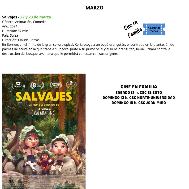 "Salvajes", proyección gratuita dentro de Cine en familia, en el Centro Sociocultural Norte-Universidad a las 12:00 horas, y en el Centro Sociocultural Joan Miró a las 18:00 horas. Para todos los públicos. Retirada de invitaciones desde el lunes en el propio centro, de 10 a 14 y de 17 a 20 horas.
