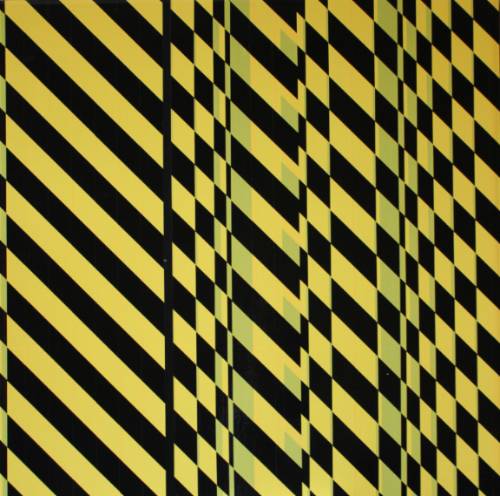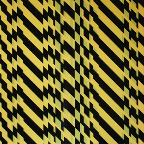 Las franjas diagonales amarillas y negras son los elementos básicos de la obra: generan la forma, el color y la textura y son tomados como píxeles que se combinan mediante un sistema binario sencillo que se torna complejo desde el momento en que se aplican direccionamientos vectoriales y distintas fórmulas matemáticas para crear efectos de torsión y movimiento. Este efecto pixelado origina formas cercanas al Op-art que obligan al espectador a releer el espacio continuamente y cuestionarse la realidad física de su entorno y su relación con ella.