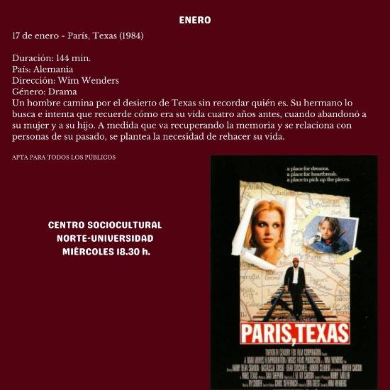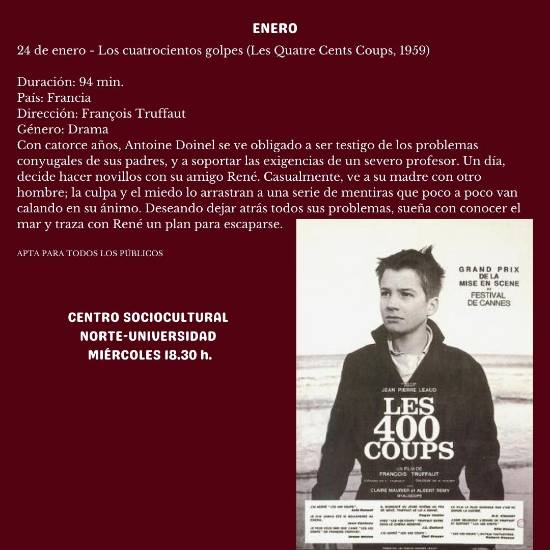 El ciclo de cine en versión original "Filmoteca", diseñado por la Concejalía de Cultura, Desarrollo y Promoción Turística, continuará su temporada en enero con películas destacadas de la historia del cine, que se proyectarán cada miércoles, a las 18.30 horas, en el Centro Sociocultural Norte-Universidad, con entrada gratuita.