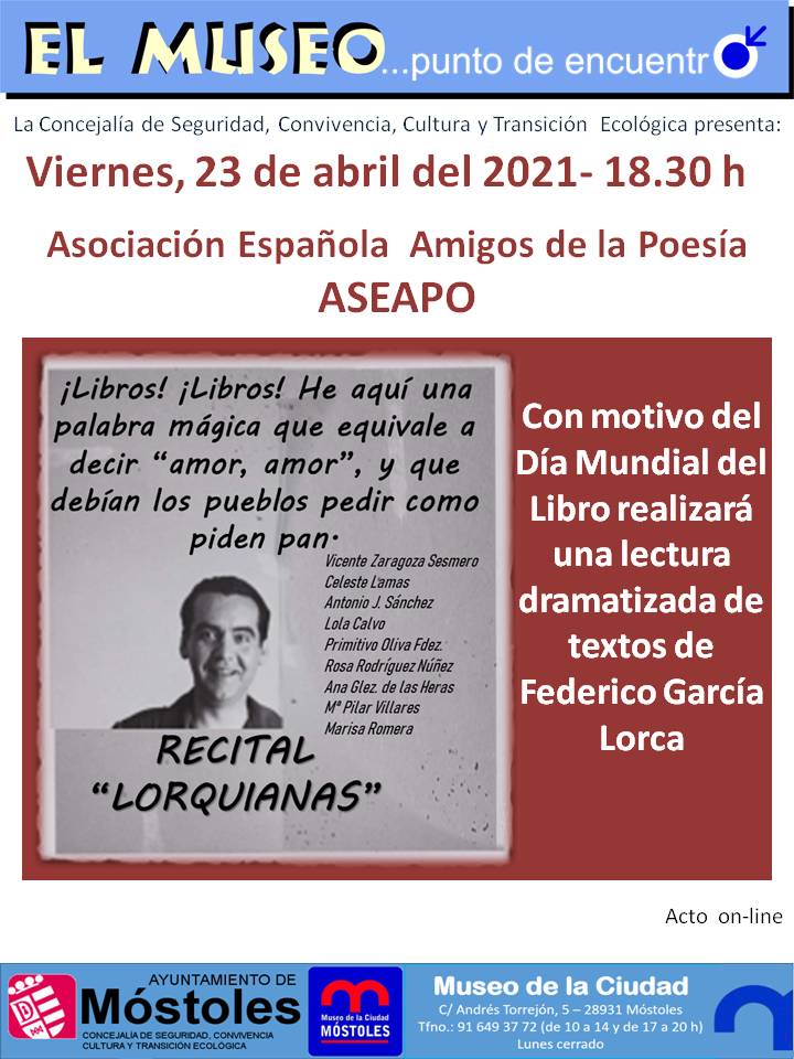 En el Museo de la Ciudad tendrá lugar el recital "Lorquianas", lectura dramatizada de textos de Federico García Lorca a cargo de la Asociación Española de Amigos de la Poesía. Realizado con motivo del Día Mundial del Libro. Se podrá seguir online a través de la página web del Museo de la Ciudad, apartado Museo Virtual.